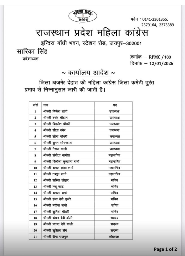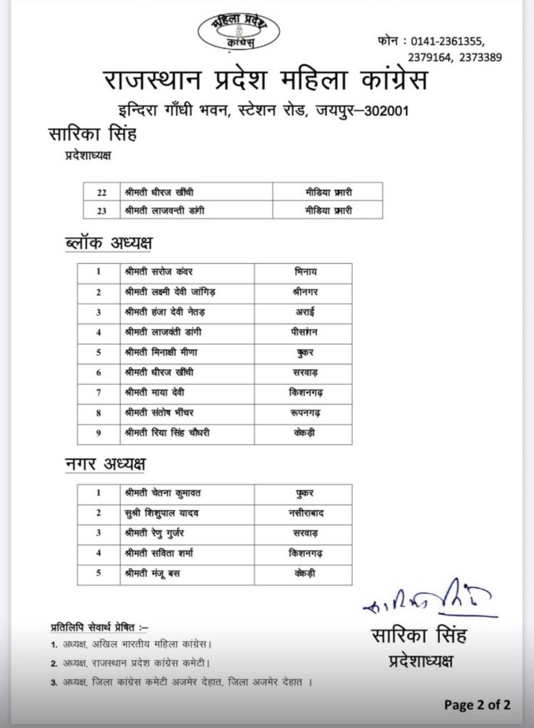 अजमेर देहात महिला कांग्रेस की नई कार्यकारिणी घोषित, ब्लॉक अध्यक्षों की नियुक्ति