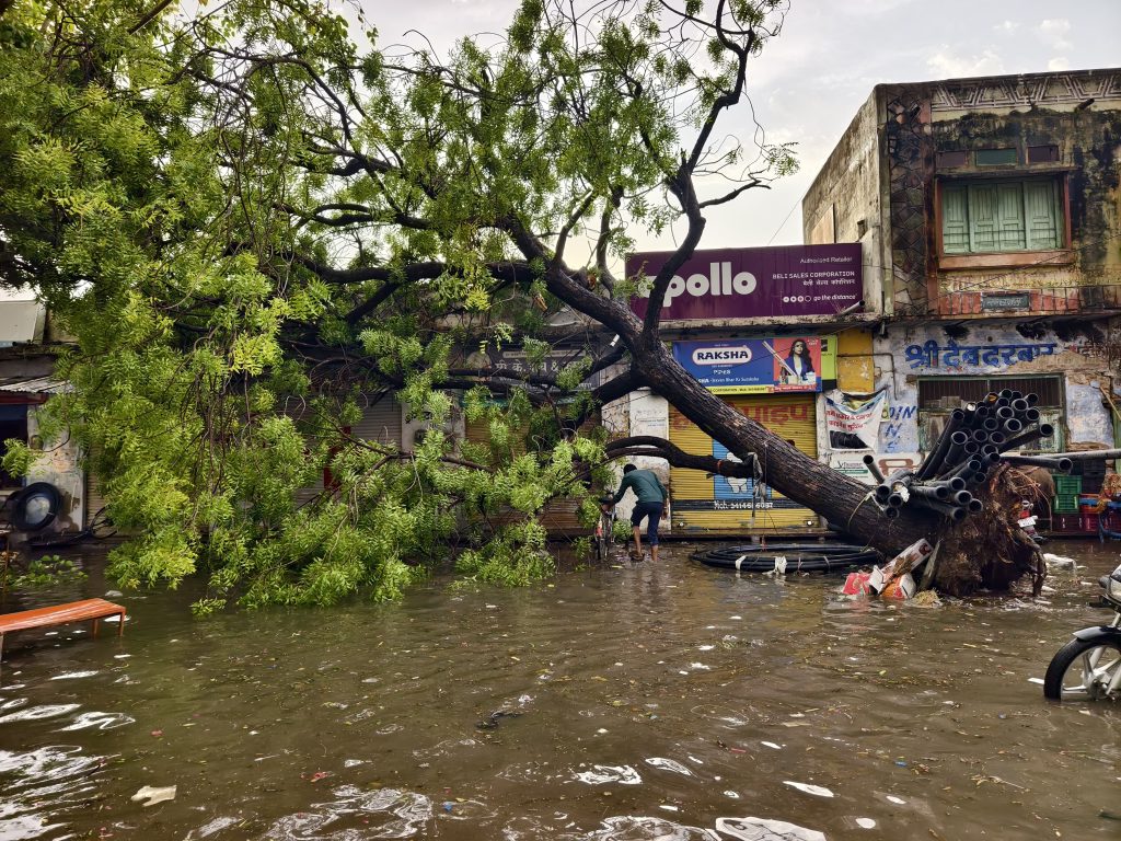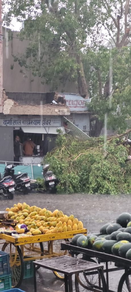 त्रिमूर्ति सर्किल पर यश इलेक्ट्रिक की दुकान पर एक भारी पीपल का पेड़ गिरा, जिससे वहां खड़े कई लोग बाल-बाल बचे। उम्मीदसासागर चौराहे पर मुखर्जी सर्किल की दीवारों पर भी पेड़ गिरने से बड़ा नुकसान हुआ। बारिश के पानी की बौछार इतनी तेज थी कि दुकानदारों को शटर गिराने पड़े। तेल मिल के 200 फीट लंबे गोदाम की तीन की छतें उड़ गईं और दो दीवारें ढह गईं। गोदाम में रखा कच्चा माल पूरी तरह बारिश में खराब हो गया।