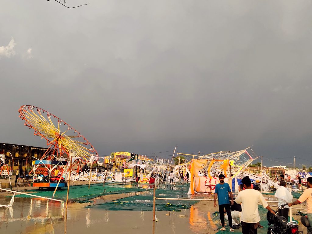 मेला परिसर में तबाही का मंजर:- राउमा विद्यालय परिसर में लगे 20 दिवसीय मेले में तूफान से वहां तबाही का मंजर देखने को मिला। अफरा-तफरी का माहौल बन गया। अस्थायी रूप से लगीं करीब 35 दुकानें, आकाशीय झूले, और चकरी झूले पूरी तरह से धराशायी हो गए। लाखों रुपये का माल पानी में भीग कर खराब हो गया। दुकानदारों ने बताया कि तेज हवाओं और बारिश के बीच दुकानों में फंसे लोगों को एक-दूसरे की मदद से किसी तरह बाहर निकाला।
