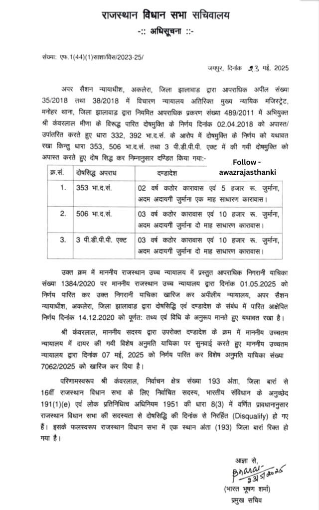 जयपुर। भारतीय जनता पार्टी के अंता से विधायक कंवरलाल मीणा की विधानसभा सदस्यता आधिकारिक रूप से समाप्त कर दी गई है। राजस्थान विधानसभा सचिवालय ने इस संबंध में आधिकारिक अधिसूचना जारी कर दी है, जिसमें स्पष्ट किया गया है कि कंवरलाल की विधायकी 1 मई 2025 से समाप्त मानी जाएगी। यह फैसला एसडीएम पर पिस्टल तानने के प्रकरण में 3 साल की सजा के चलते लिया गया है।