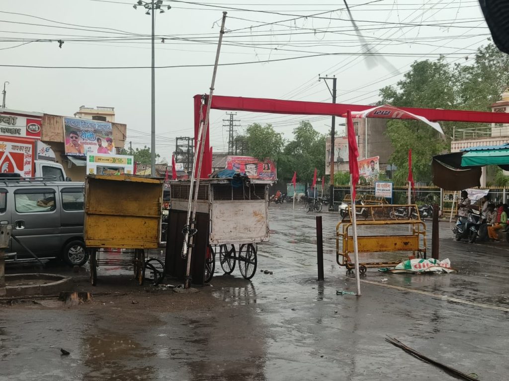 पहले तेज चली आंधी से नगर धूल के गुब्बार से भर गया चारों ओर अंधकार छाता दिखाई देने लगा। पाल पलिये, बैनर, पोस्टर फटते उड़ते नजर आने लगे। अचानक आई बारिश ने नगर को पानी से तर बतर ककर भिगो दिया। थोड़ी देर हल्की बारिश से मौसम खुशनुमा हो गया और लोगो ने गर्मी से राहत की सांस ली। हालांकि इस आंधी बारिश से इस बार कोई ज्यादा तबाही नहीं मची। विद्युत आपूर्ति जरूर हल्की बाधित हुई। अभी भी बारिश जारी है।