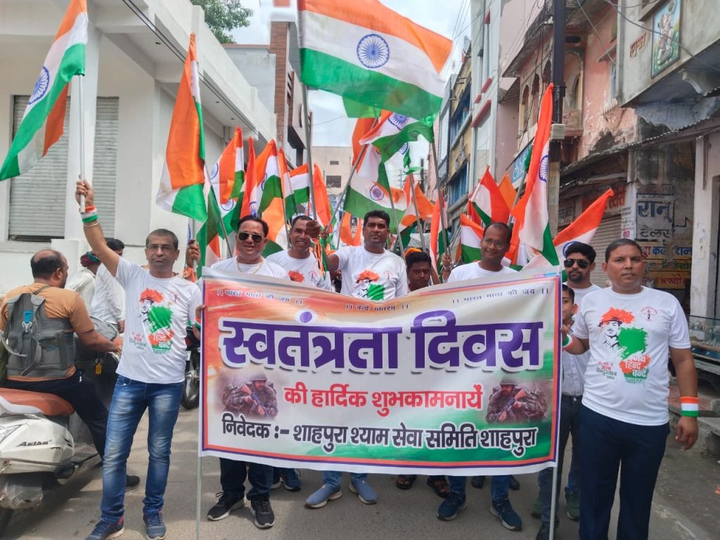 शाहपुरा, 15 अगस्त 2025। देश के 79वें स्वतंत्रता दिवस के अवसर पर शाहपुरा में श्याम सेवा समिति के तत्वावधान में त्रिमूर्ति शहीद स्मारक चौराहे पर राष्ट्रीय पर्व को पूरे उत्साह, देशभक्ति और सम्मान के साथ मनाया गया। इस अवसर पर आयोजित भव्य तिरंगा यात्रा और सामूहिक राष्ट्रगान ने सभी के मन में देशप्रेम की भावना को और प्रबल किया।प्रातः 10:00 बजे नगर के महलों के चौक से शुरू हुई विशाल तिरंगा यात्रा में स्कूली विद्यार्थी, समिति के सदस्य, और नगर के गणमान्य नागरिकों ने उत्साहपूर्वक भाग लिया। भारत माता की मनमोहक जीवंत झांकी इस यात्रा की शोभा बढ़ाने वाली प्रमुख आकर्षण रही। तिरंगे के साथ यह यात्रा सदर बाजार, पुराने बस स्टैंड, और वेलकम चौराहे से होती हुई त्रिमूर्ति शहीद स्मारक चौराहे पर सम्पन्न हुई।