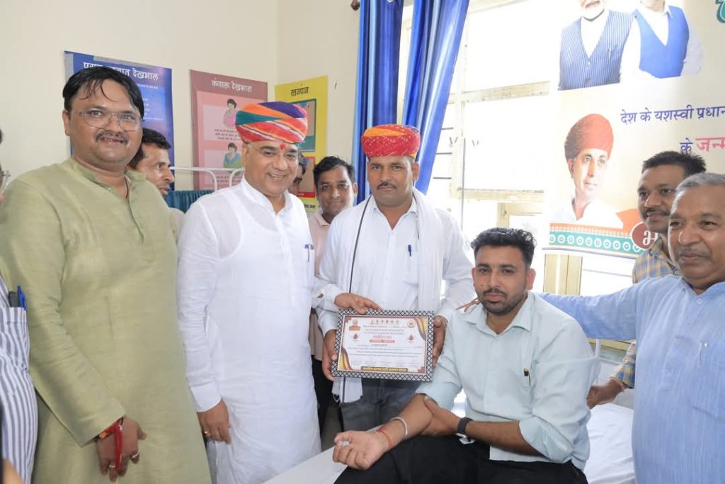 अजमेर | जल संसाधन मंत्री एवं पुष्कर विधायक सुरेश सिंह रावत ने आज प्रधानमंत्री नरेंद्र मोदी के 75वें जन्मदिवस के उपलक्ष्य में चल रहे सेवा पखवाड़ा कार्यक्रमों की श्रृंखला के अंतर्गत भारतीय जनता पार्टी, अजमेर देहात द्वारा पुष्कर विधानसभा क्षेत्र के ग्राम नरवर की पीएचसी में आयोजित विशाल रक्तदान शिविर में सहभागिता की।